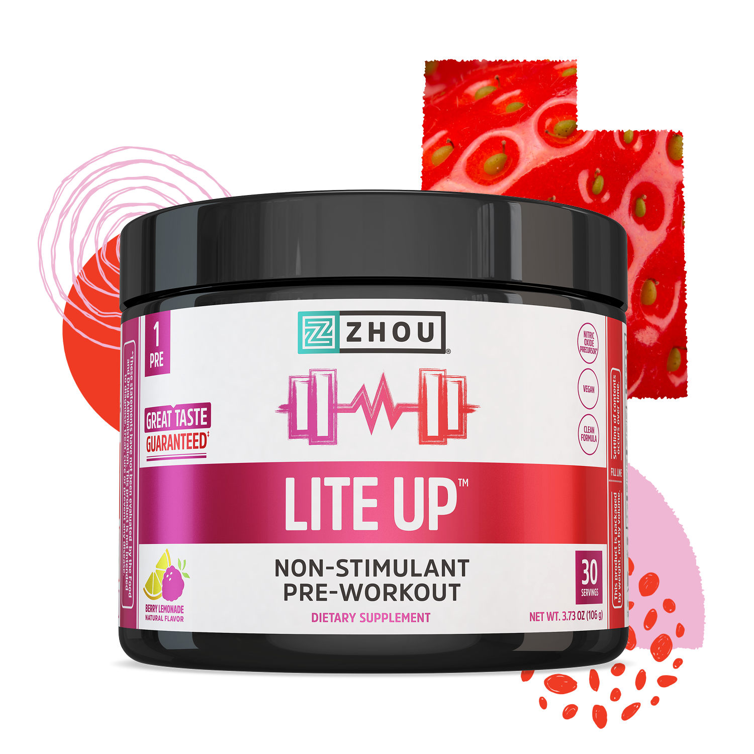 Get powerful workouts without the caffeine jitters. Yeah, we did that. Lite Up is a non-stimulant pre-workout powder designed to give you the energy and endurance you need for great workouts, without caffeine.