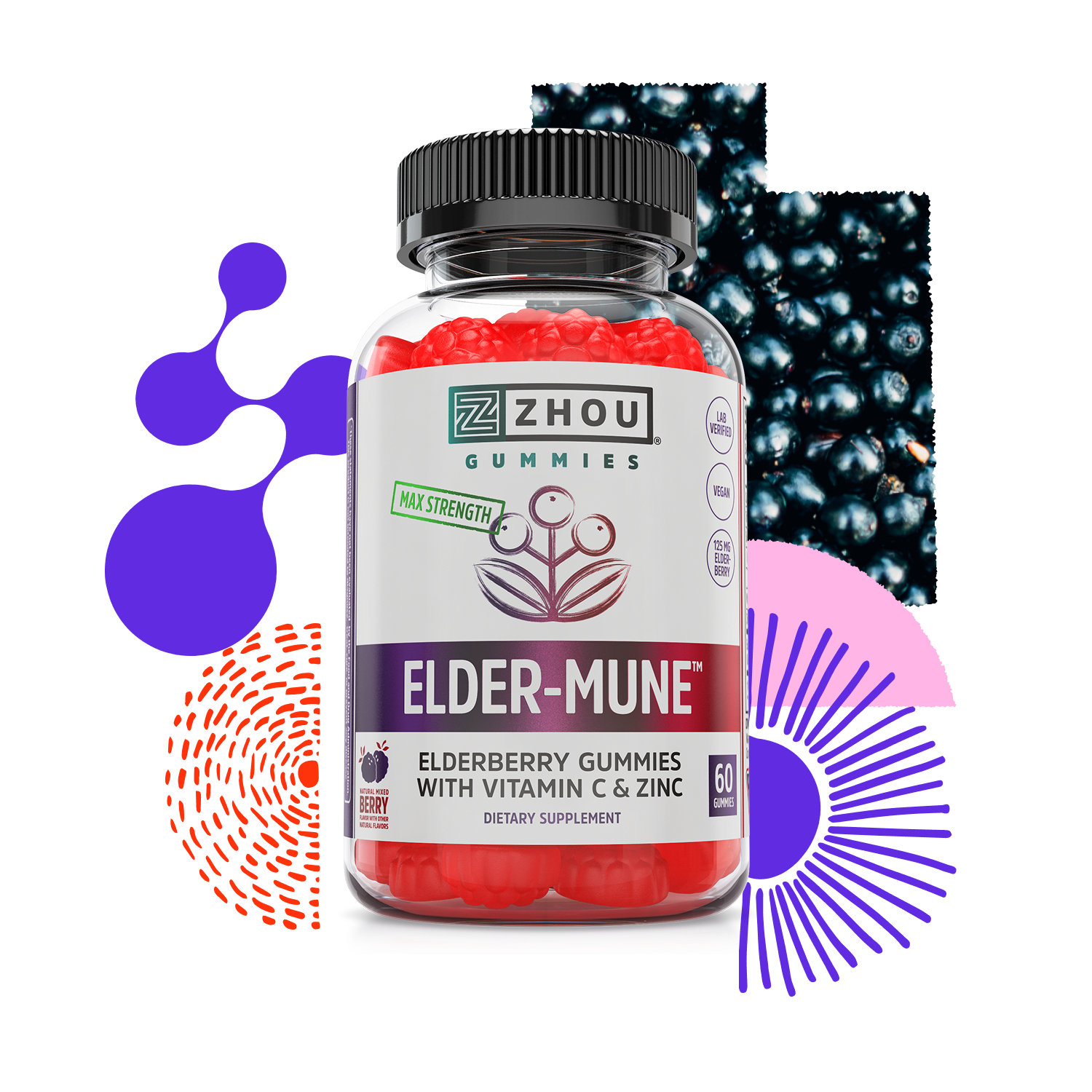Zhou Elder-Mune™ Gummies offer a traditional wellness staple plus zinc, an essential mineral for immune function, and antioxidants from vitamin C to support your daily defenses.* This high-quality supplement is produced in our GMP facility that is certified by NSF, with ingredients that are triple-tested to meet strict guidelines on potency, purity, and contaminants.**