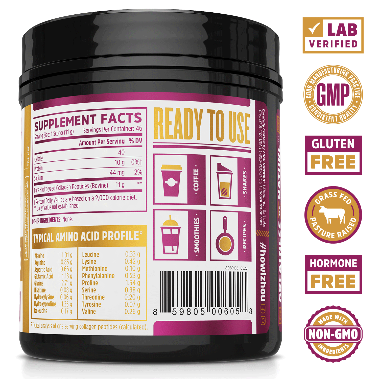 At Zhou we care about what’s on the surface, and even more about what’s beneath it. Collagen is an essential part of skin, hair, bone and joint health, and our bodies make less collagen as we age. We created our Collagen Peptide powder to be an essential part of your daily wellness routine. Our product is the key to younger looking skin, more luscious locks, and comfortable joints. Collagen also helps fuel bones, tendons, and connective tissue— while providing 18 essential aminos needed to support healthy muscle cells. Our pure, hormone-free collagen hydrolysate can help to replenish lost collagen and may help support cell turnover. With quality you can trust, our collagen is sustainably sourced from grass fed and pasture raised cattle, so not only will your body feel great, but your conscious will too.
