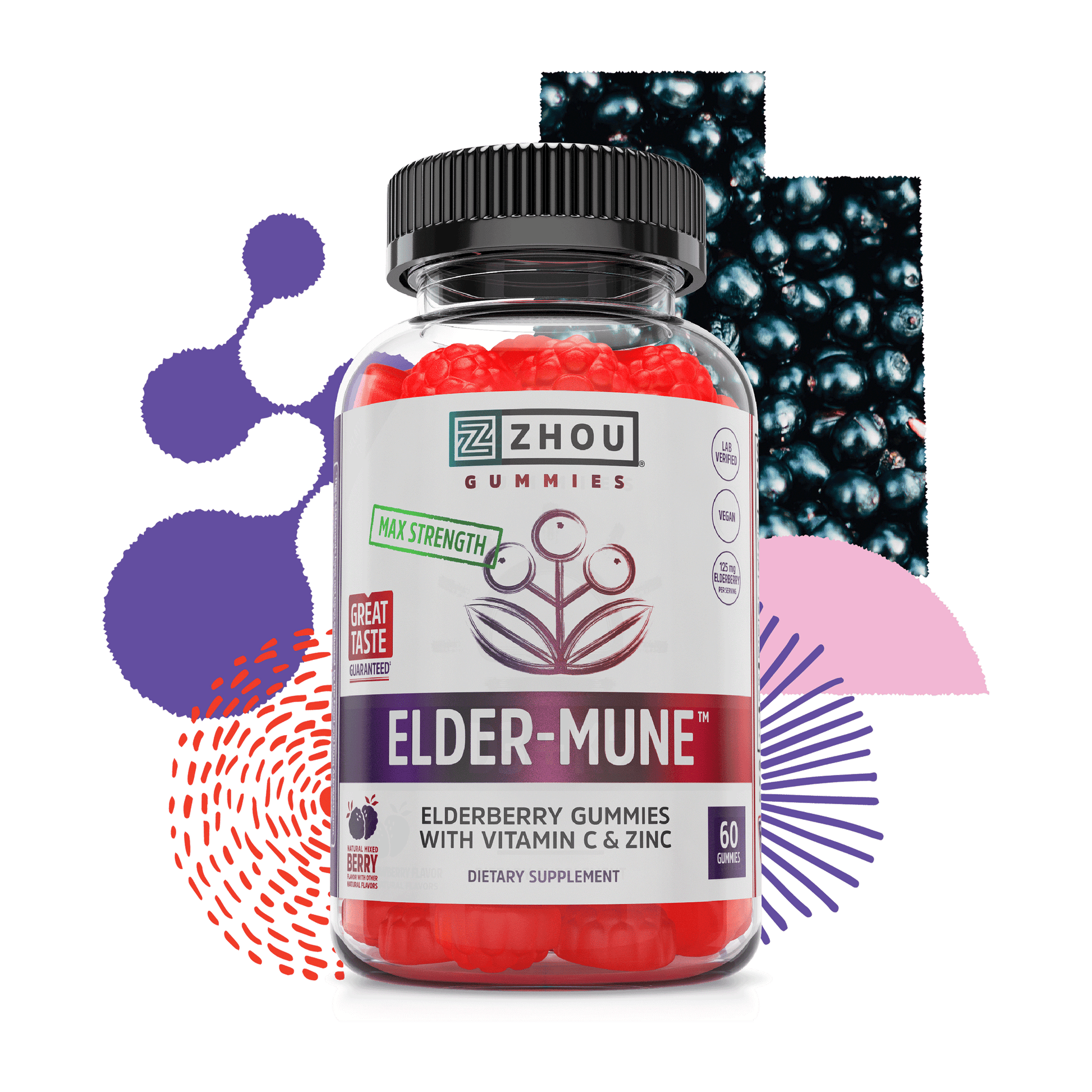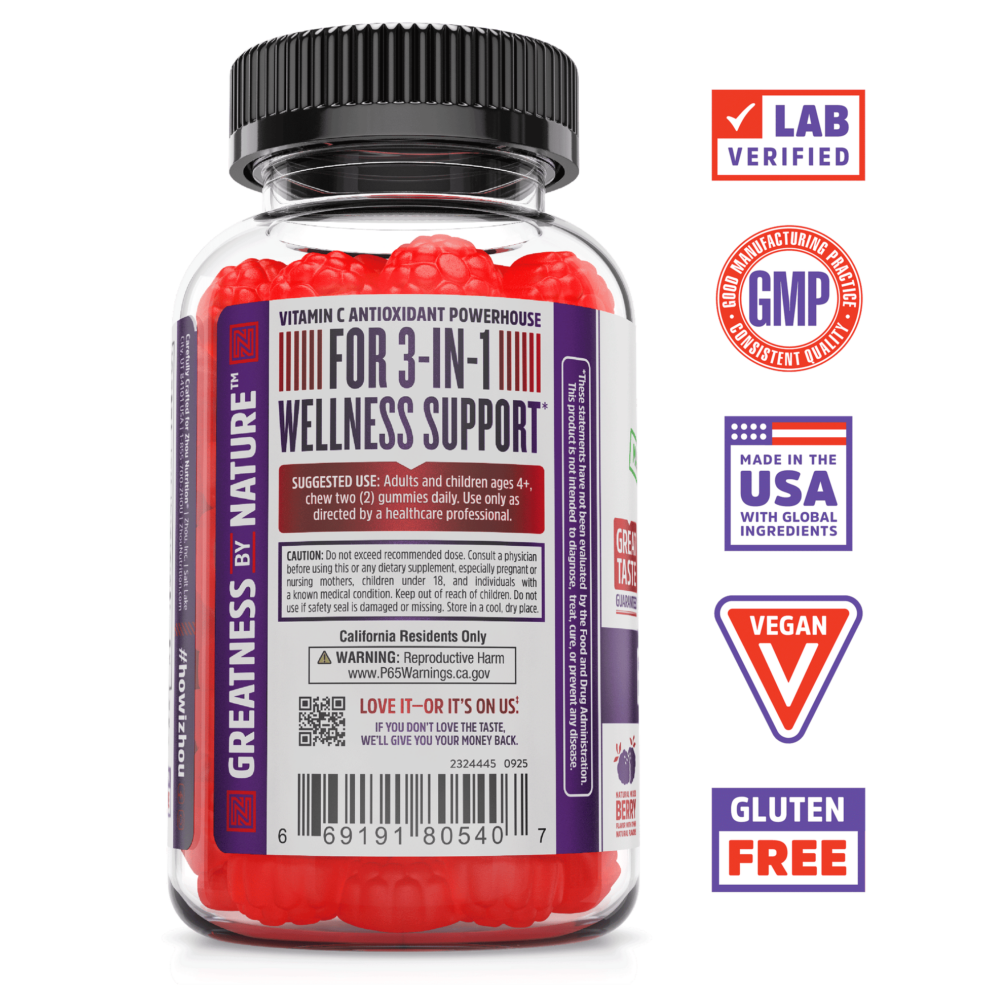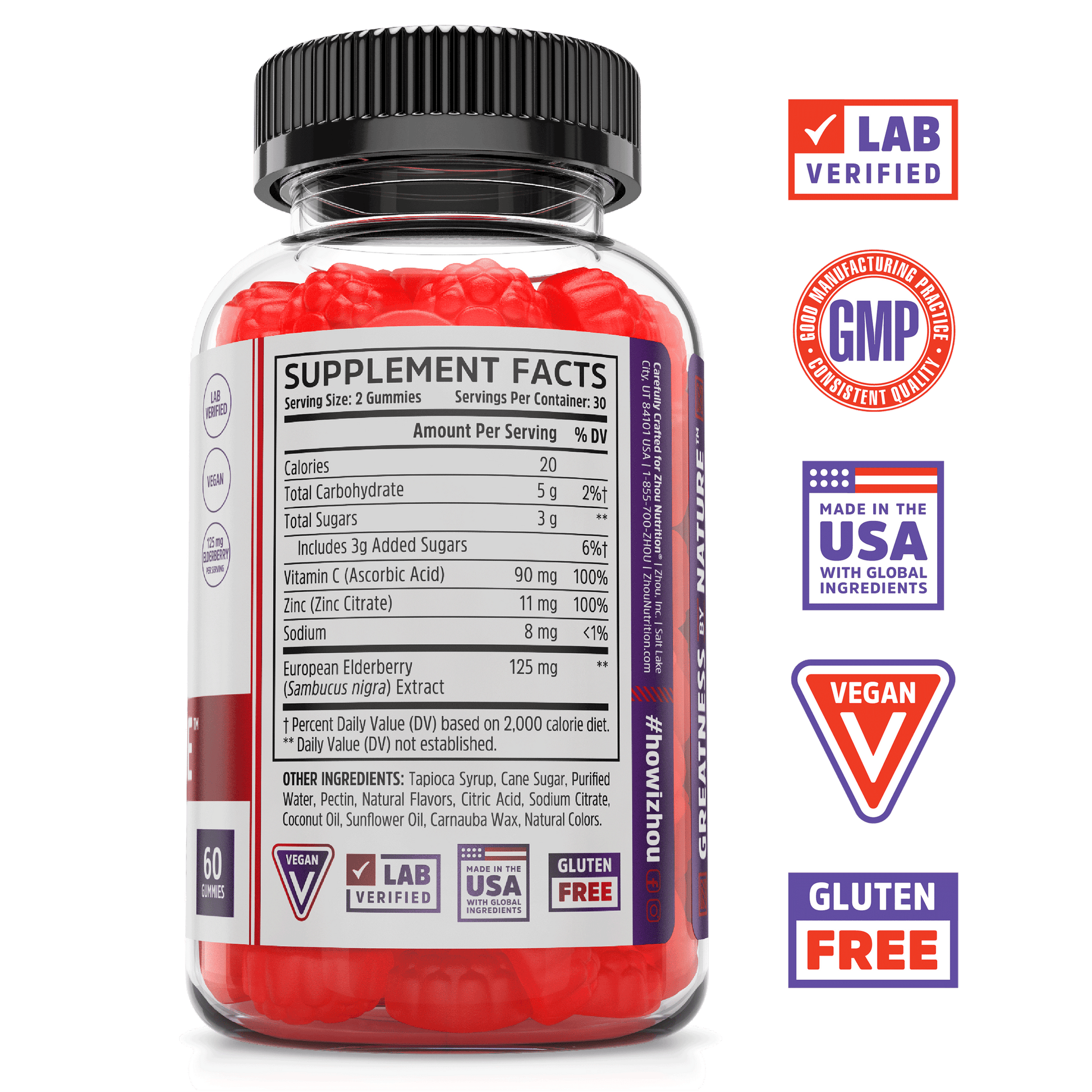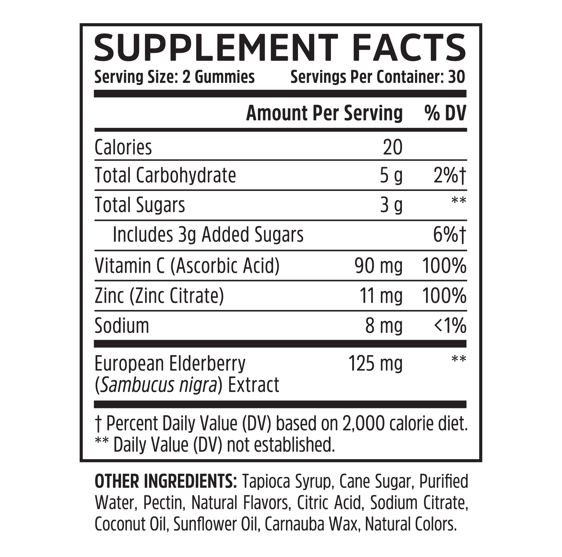 Get the big, robust antioxidant power you need in our delicious Elderberry gummies. Sambucus Elderberry is a potent antioxidant extract that has been used for centuries to support immune system health, so we’ve combined it with vitamin C and zinc to create our 3-in-1 immunity support formula. These delicious little gummies may help support the body in its fight against free radicals and to help keep your body healthy, balanced, and functioning at its finest. Plus, they’re free of gelatins, making them a vegan friendly option your whole family (ages 4 and up) can trust.