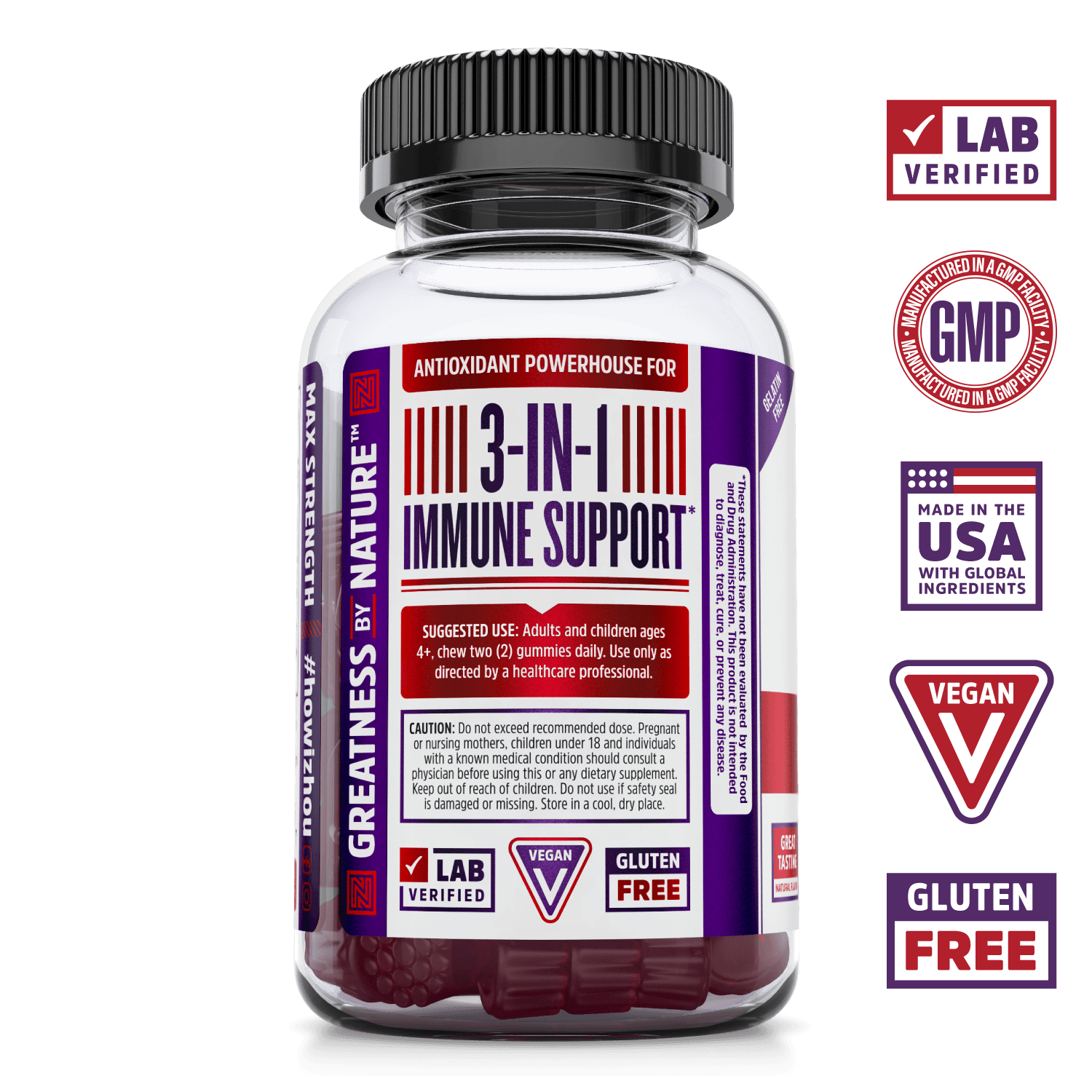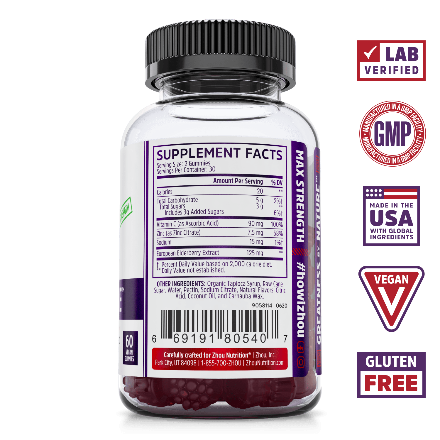 Get the big, robust antioxidant power you need in our delicious Elderberry gummies. Sambucus Elderberry is a potent antioxidant extract that has been used for centuries to support immune system health, so we’ve combined it with vitamin C and zinc to create our 3-in-1 immunity support formula. These delicious little gummies may help support the body in its fight against free radicals and to help keep your body healthy, balanced, and functioning at its finest. Plus, they’re free of gelatins, making them a vegan friendly option your whole family (ages 4 and up) can trust.