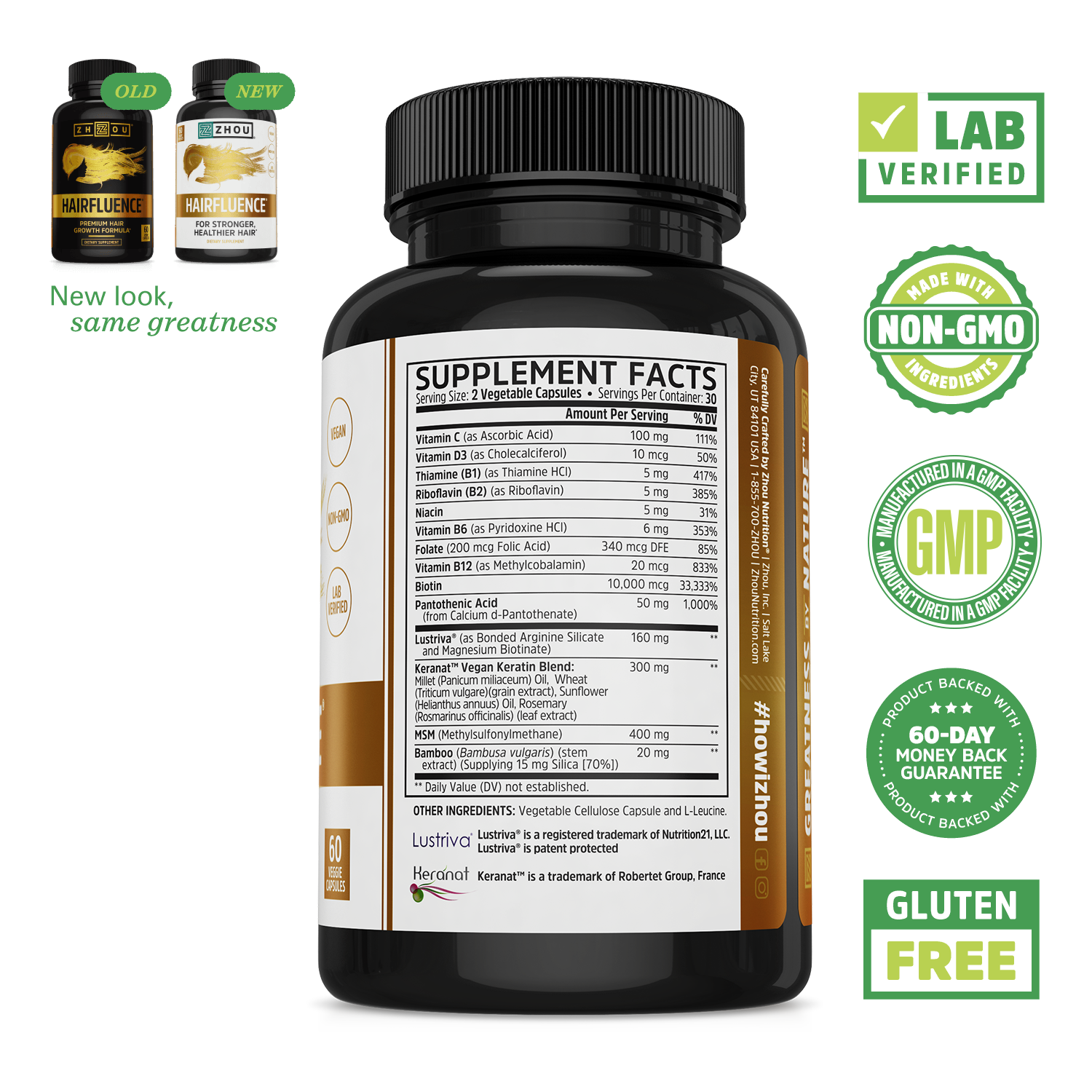 What’s new? Lustriva® combines Arginine Silicate and Magnesium Biotinate for a premium formula that promotes healthier-looking skin and hair. Keranat®, a clinically-studied ingredient from the Loire Valley of France, works to support the production of Keratin. It also enhances the release of IGF-1 and KGF, growth hormones produced by specialized cells in your hair follicles. Say goodbye to breakage, take two capsules a day for honest to goodness growth.