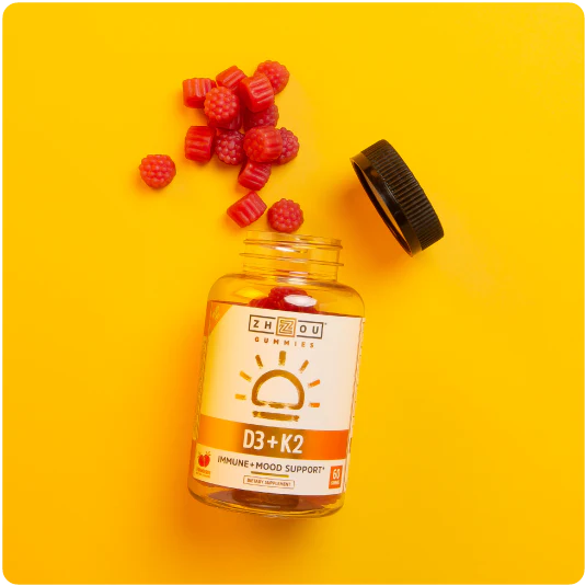 Looking to simplify your supplement routine? Zhou has you covered. Made with both vitamin D and vitamin K, our D3 + K2 Gummies provide essential support for bones, teeth, and immune function.* Vitamin D is especially helpful in directing the proper absorption of calcium into the bones with our high bioavailability formula.* D3 + K2 Gummies deliver on simplicity, just take one delicious strawberry-flavored gummy a day for support from sun-up to sun-down.