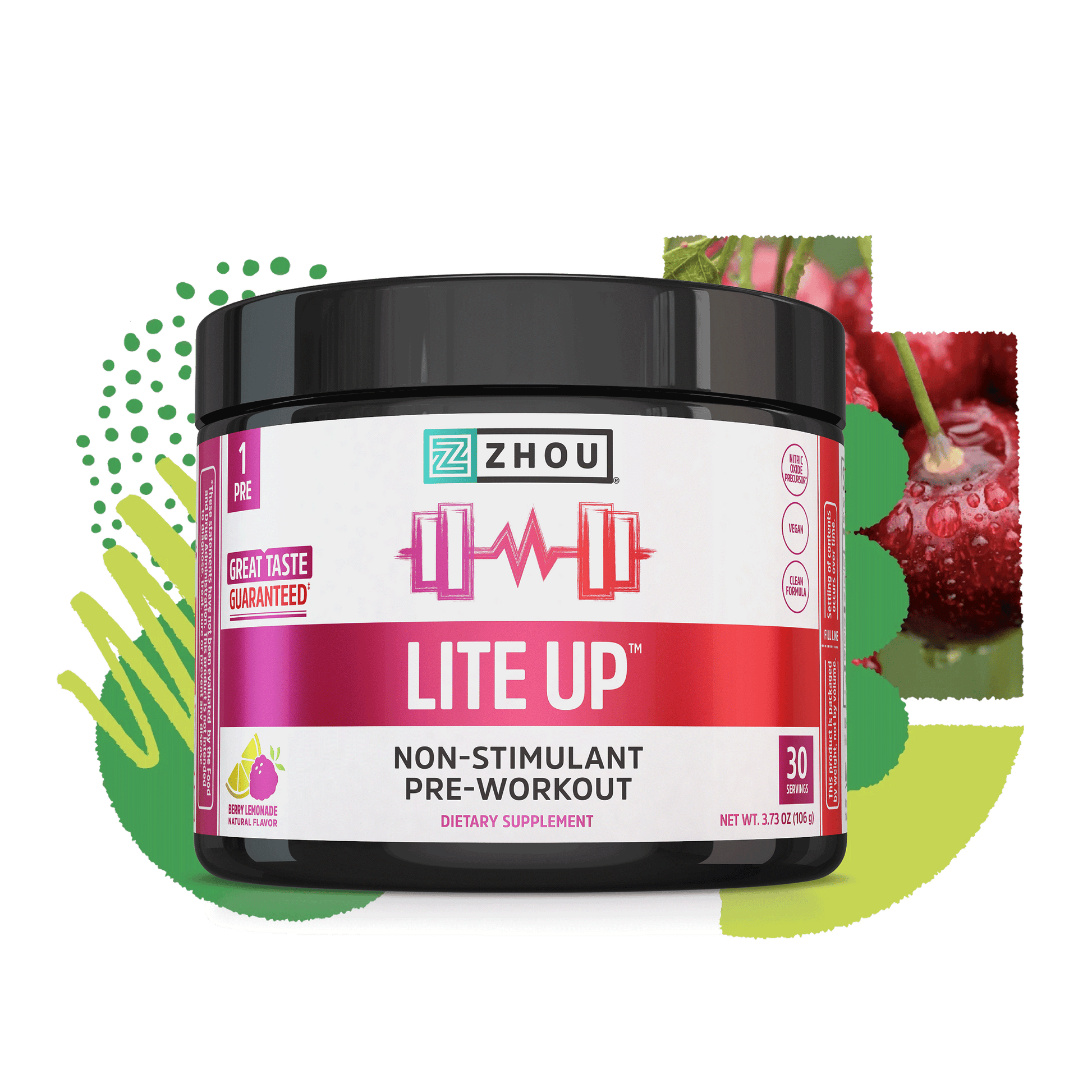 Get powerful workouts without the caffeine jitters. Yeah, we did that. Lite Up is a non-stimulant pre-workout powder designed to give you the energy and endurance you need for great workouts, without caffeine.