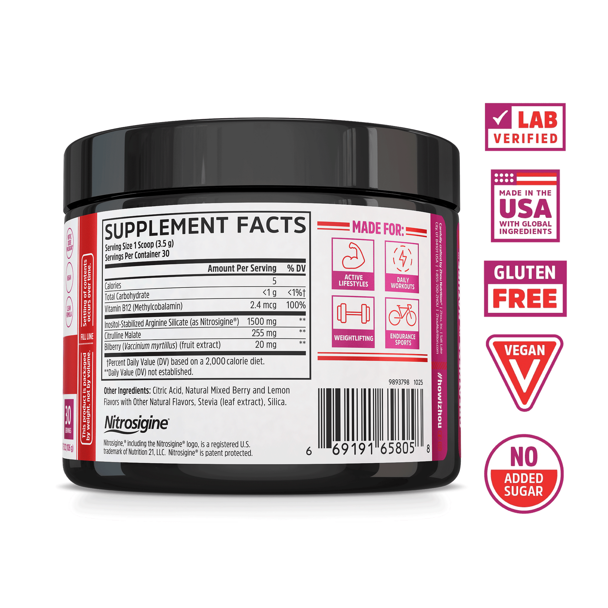 Step up your pump with Nitrosigine®, a patented complex of bonded arginine silicate that promotes blood flow. This powerful and safe nitric oxide booster supports strength, endurance and energy. -