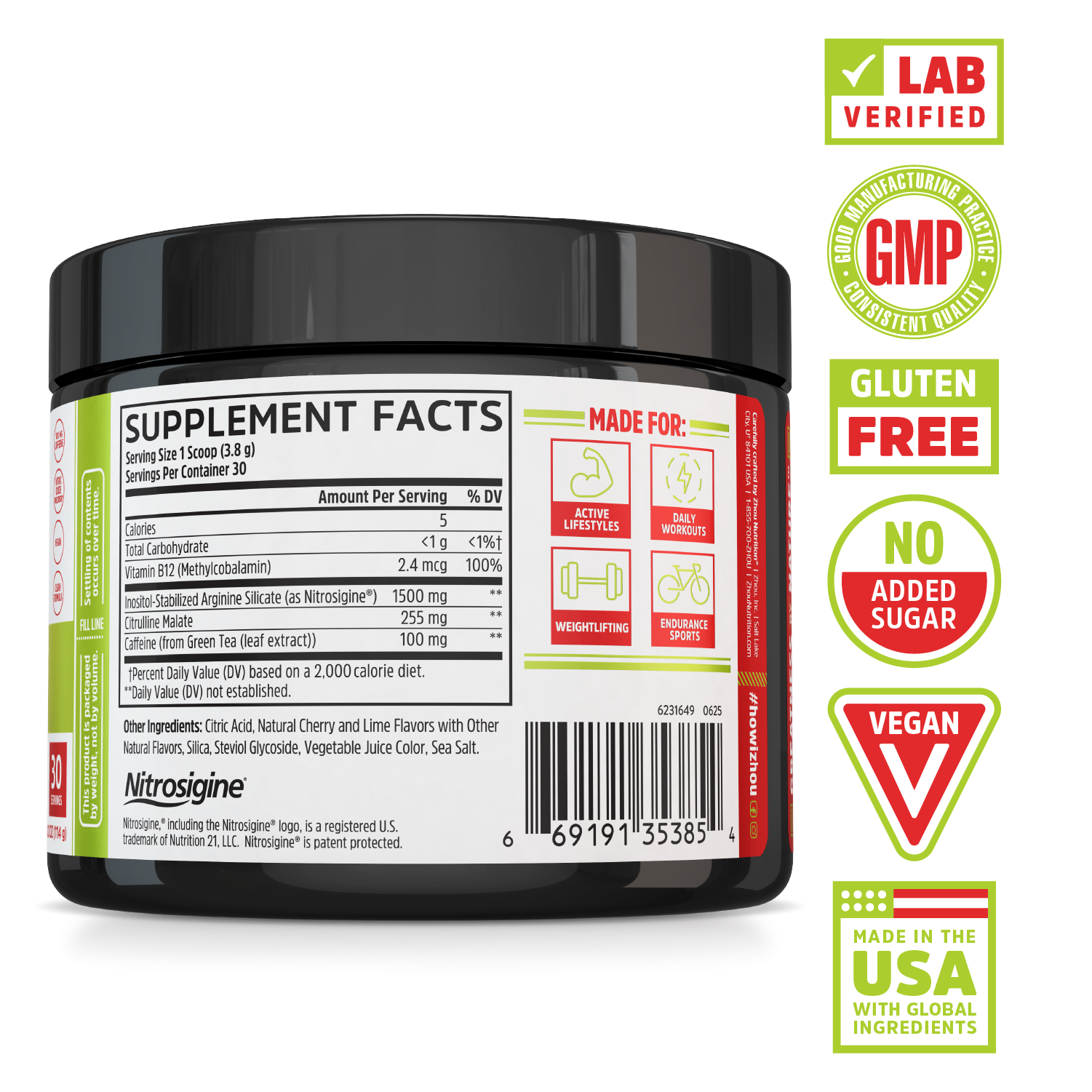 Step up your pump with Nitrosigine®, a patented complex of bonded arginine silicate that promotes blood flow. This powerful and safe nitric oxide booster supports strength, endurance and energy. -