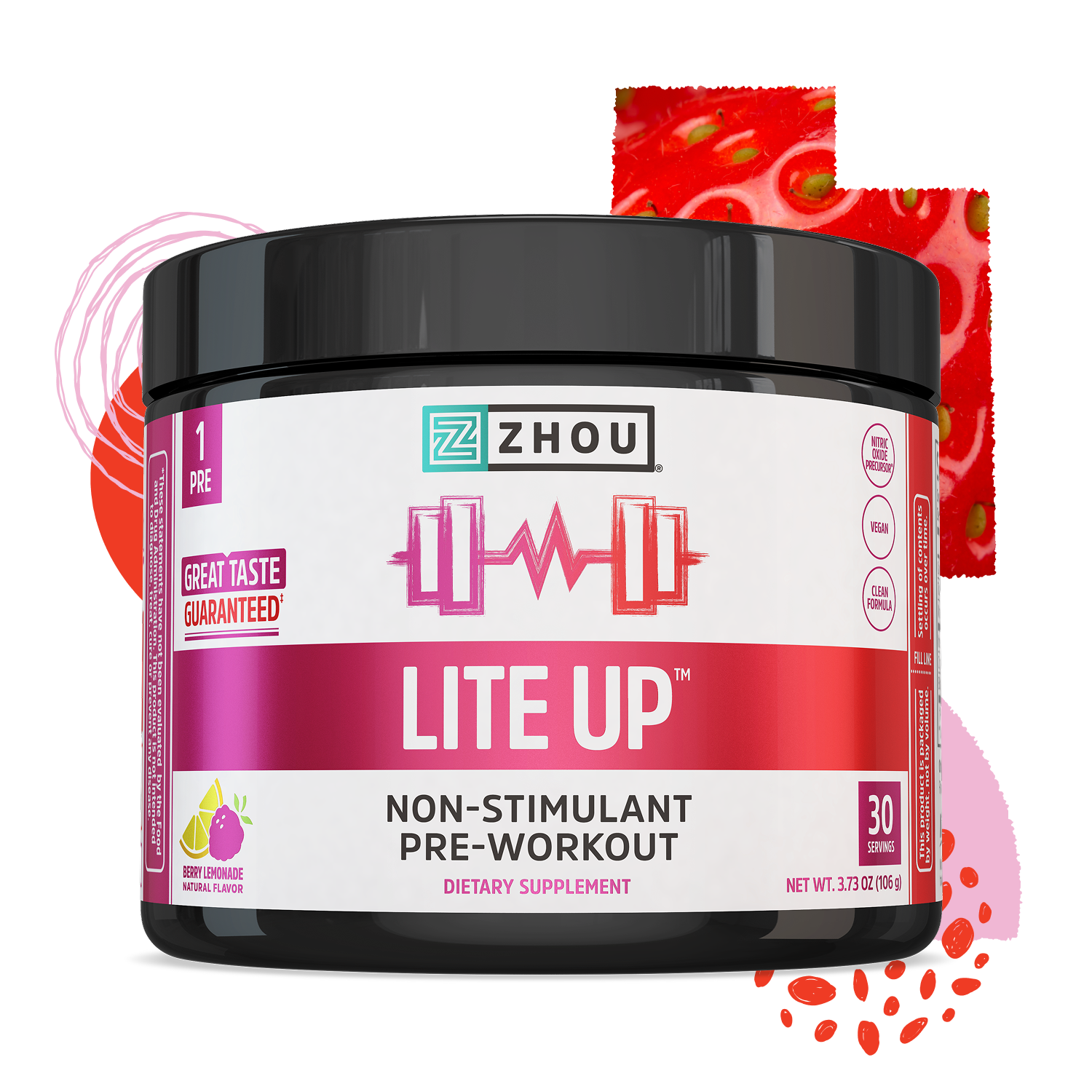 Get powerful workouts without the caffeine jitters. Yeah, we did that. Lite Up is a non-stimulant pre-workout powder designed to give you the energy and endurance you need for great workouts, without caffeine.