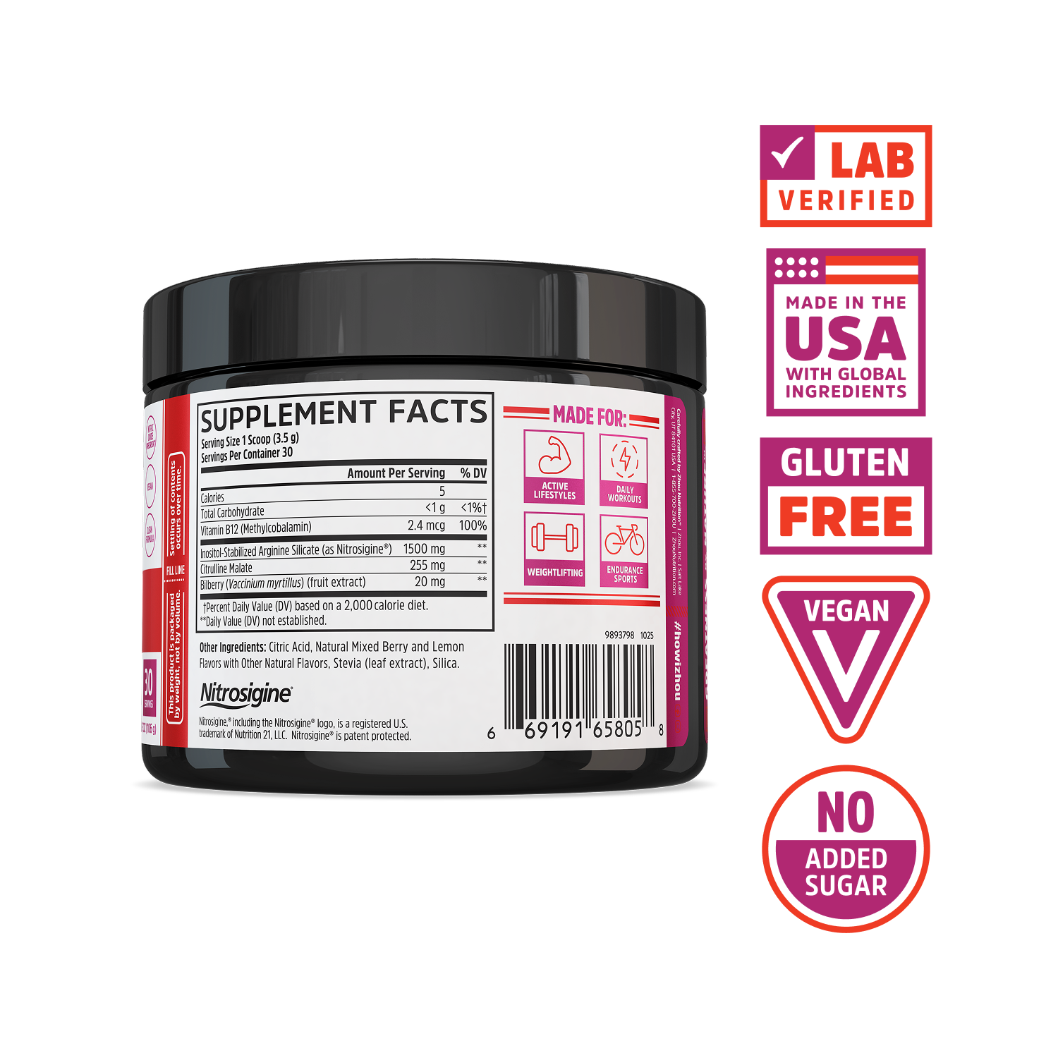 Step up your pump with Nitrosigine®, a patented complex of bonded arginine silicate that promotes blood flow. This powerful and safe nitric oxide booster supports strength, endurance and energy. -