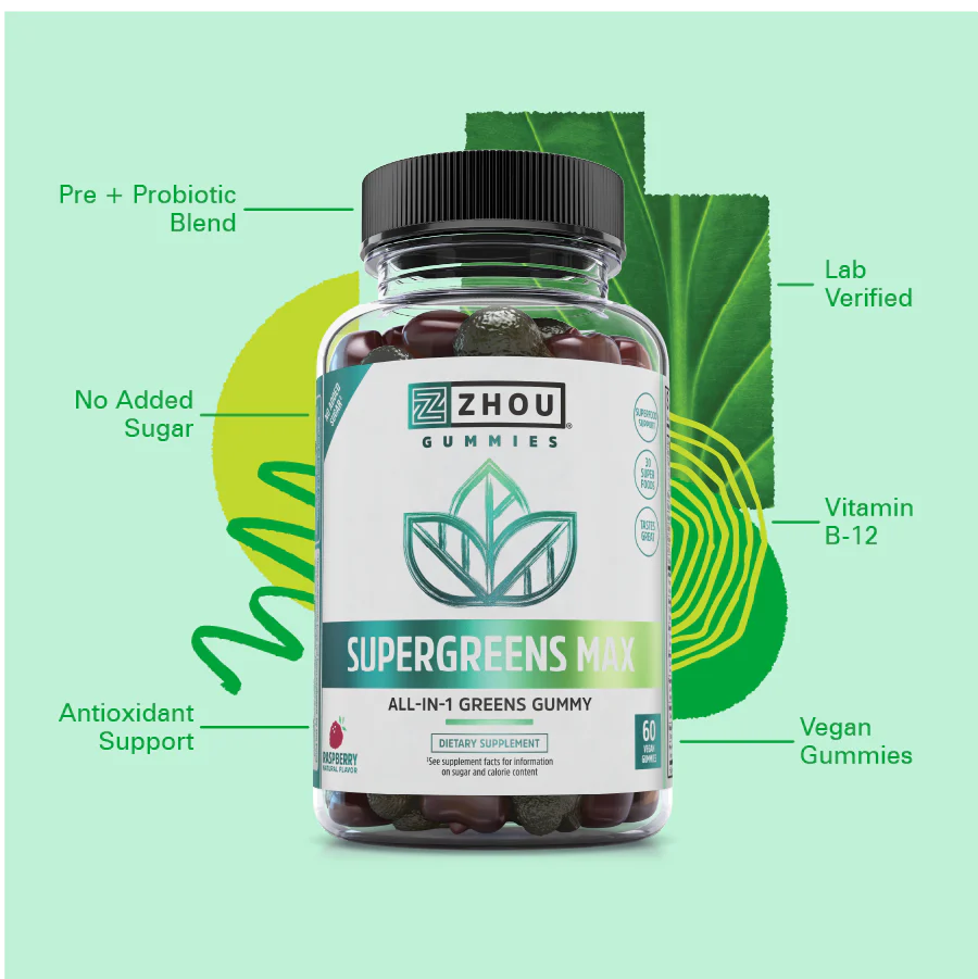 Revitalize your day with Zhou's superfood-infused gummies. This potent blend of antioxidants, metabolism boosters, and immune support is a comprehensive greens supplement packed with vitamins, minerals, antioxidants, and superfoods.