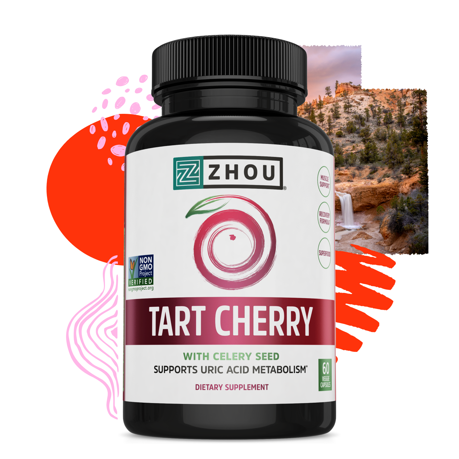 Some foods can raise uric acid levels, leaving you feeling restless and off your game. Zhou Tart Cherry Extract with Celery Seed is formulated to help support muscle recovery and uric acid metabolism, so you can move freely and get back to doing what you love.* It harnesses the juicy benefits of tart cherry in convenient capsules.