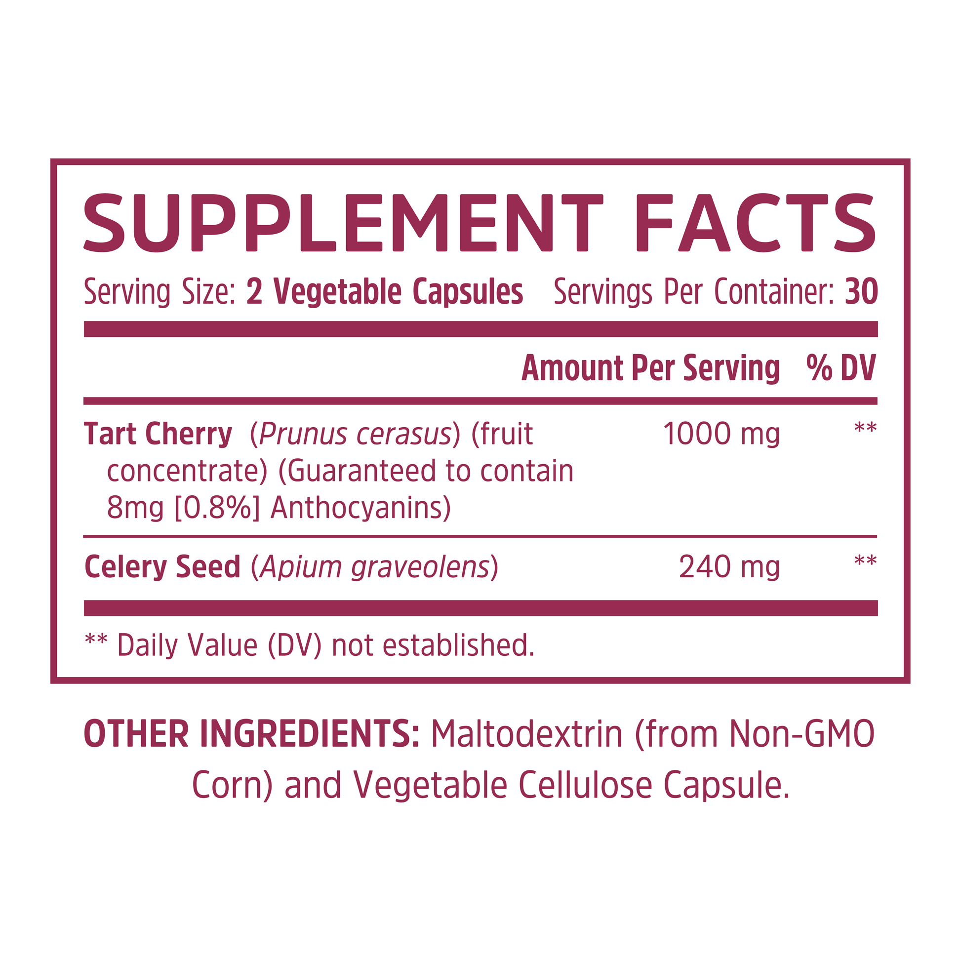 Zhou Tart Cherry Extract with Celery Seed is formulated to help support muscle recovery and uric acid metabolism, all in convenient vegan capsules.*